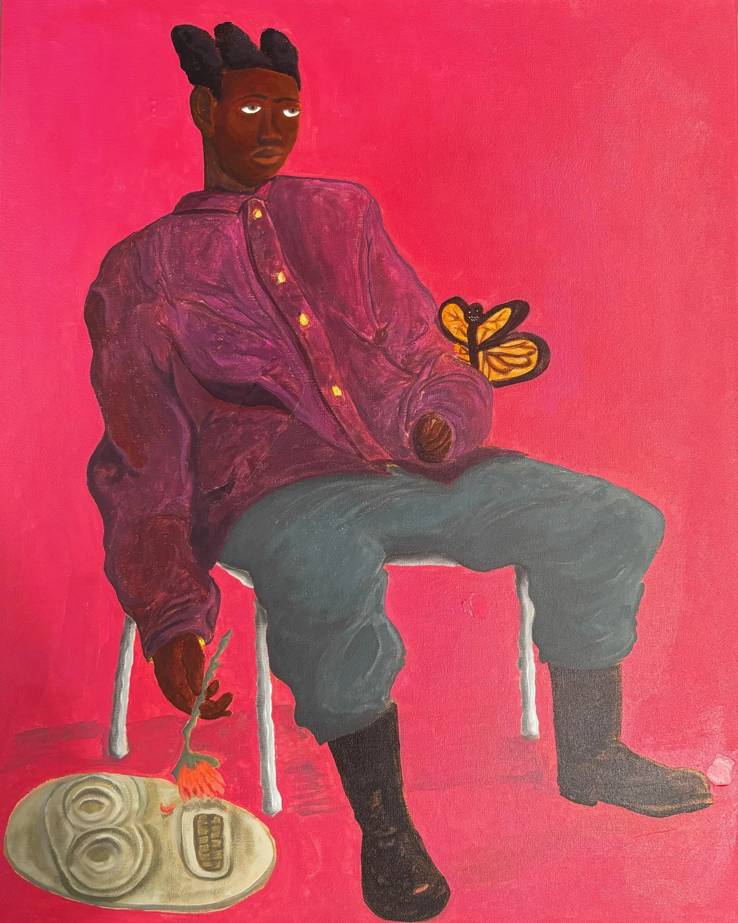 A butterfly rest on the figure’s arm, representing evolution and personal growth, while a discarded mask rests at his feet — suggesting the release of past identities. Set against a vivid pink backdrop, the work highlights the tension between stillness and change, reminding us that transformation often begins in moments of pause.