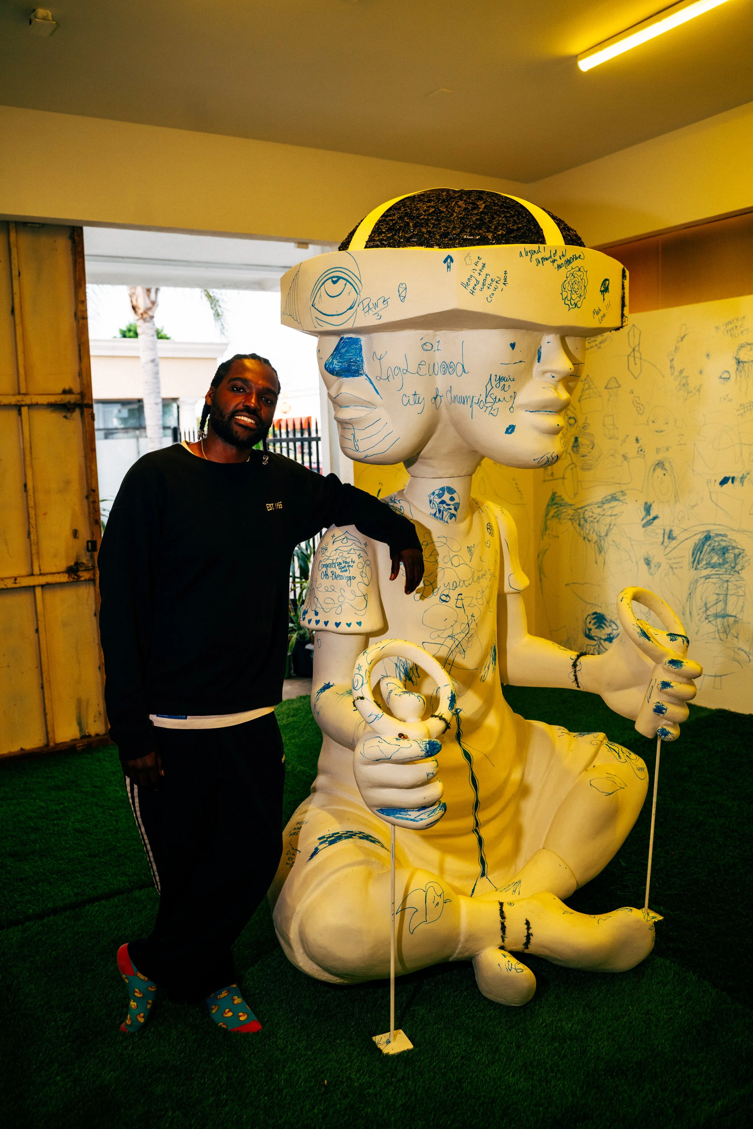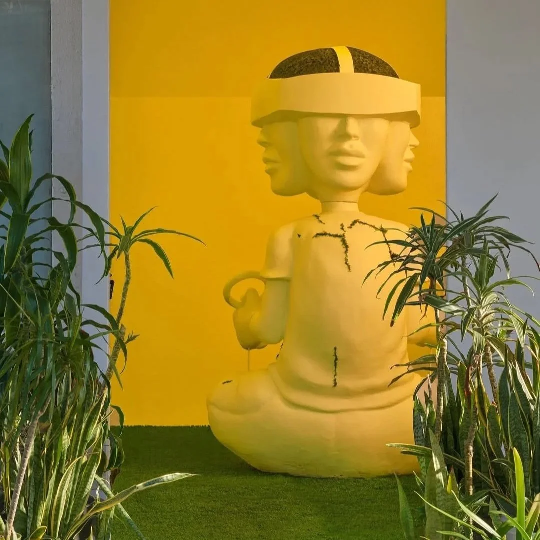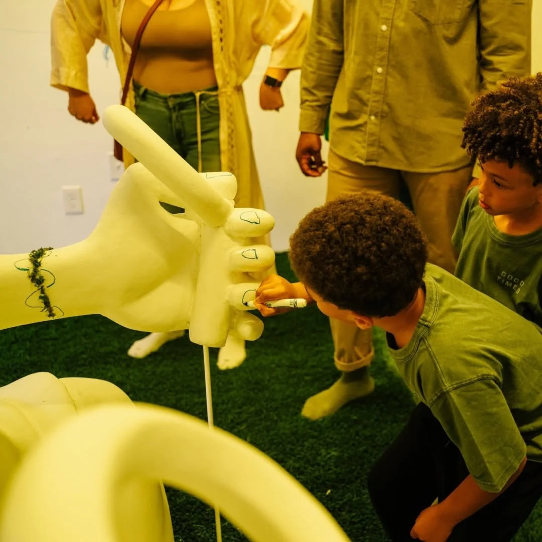 At the center of the installation is Life is Miroculous, a larger-than-life sculpture of a child-like deity with 360-degree vision who controls its own world. The work explores the idea that life can feel like a simulation while emphasizing the importance of staying connected to the real world around us. Throughout the space, I incorporated multi-sensory elements that evoke the experience of walking through nature, creating a calm environment for reflection. Visitors are also invited to participate by leaving their own marks on the walls and sculpture, transforming the exhibition into a shared act of creation.